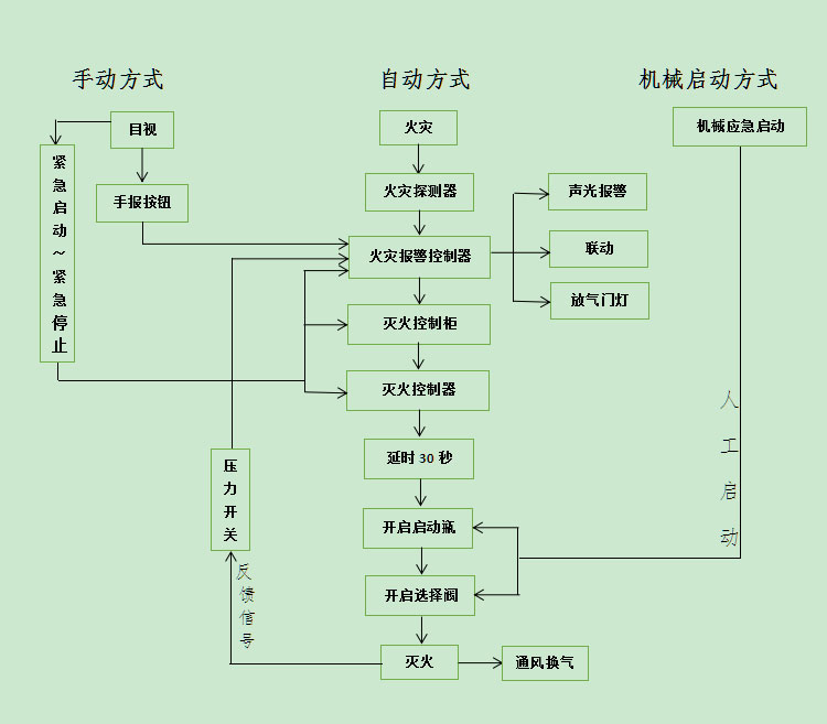 1、系統(tǒng)的啟動(dòng)方式為自動(dòng)控制、手動(dòng)控制和機(jī)械應(yīng)急手動(dòng)控制三種。一般情況下應(yīng)使用手動(dòng)控制,在保護(hù)區(qū)無人的情況下可以轉(zhuǎn)換為自動(dòng)控制,當(dāng)自動(dòng)控制和手動(dòng)控制不能執(zhí)行時(shí),應(yīng)采用機(jī)械應(yīng)急手動(dòng)控制。